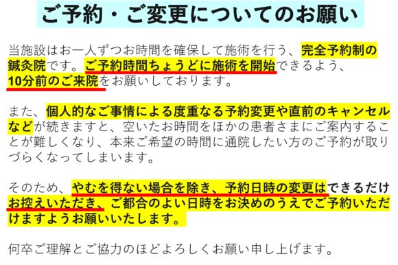 当施設での施術は完全予約制となっております。施術をご希望の際には、必ずお電話にてご予約をお願い致します。またキャンセルや変更の際にもお電話くださいますようお願い申し上げます。